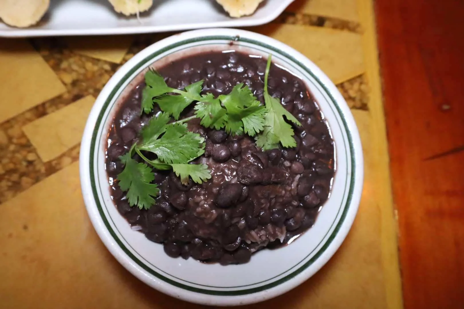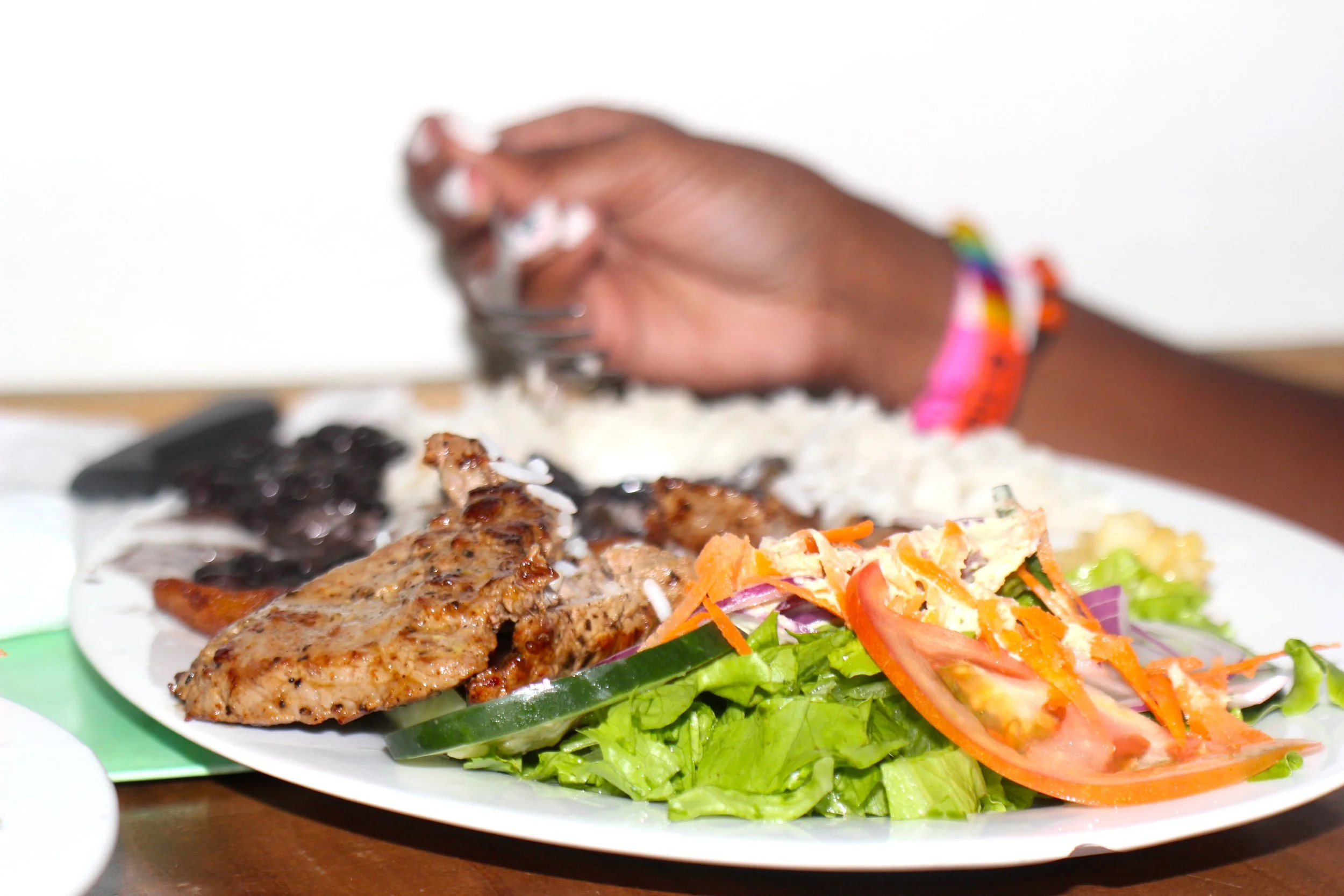 A plate of food with grilled meat, rice, salad with sliced tomatoes, lettuce, and shredded carrots, and black beans, with a person's hand reaching for more rice in the background.