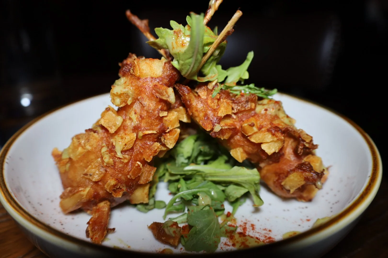 Close-up of two fried chicken drumsticks covered in crushed peanuts, garnished with fresh greens, served on a white plate with a gold rim.