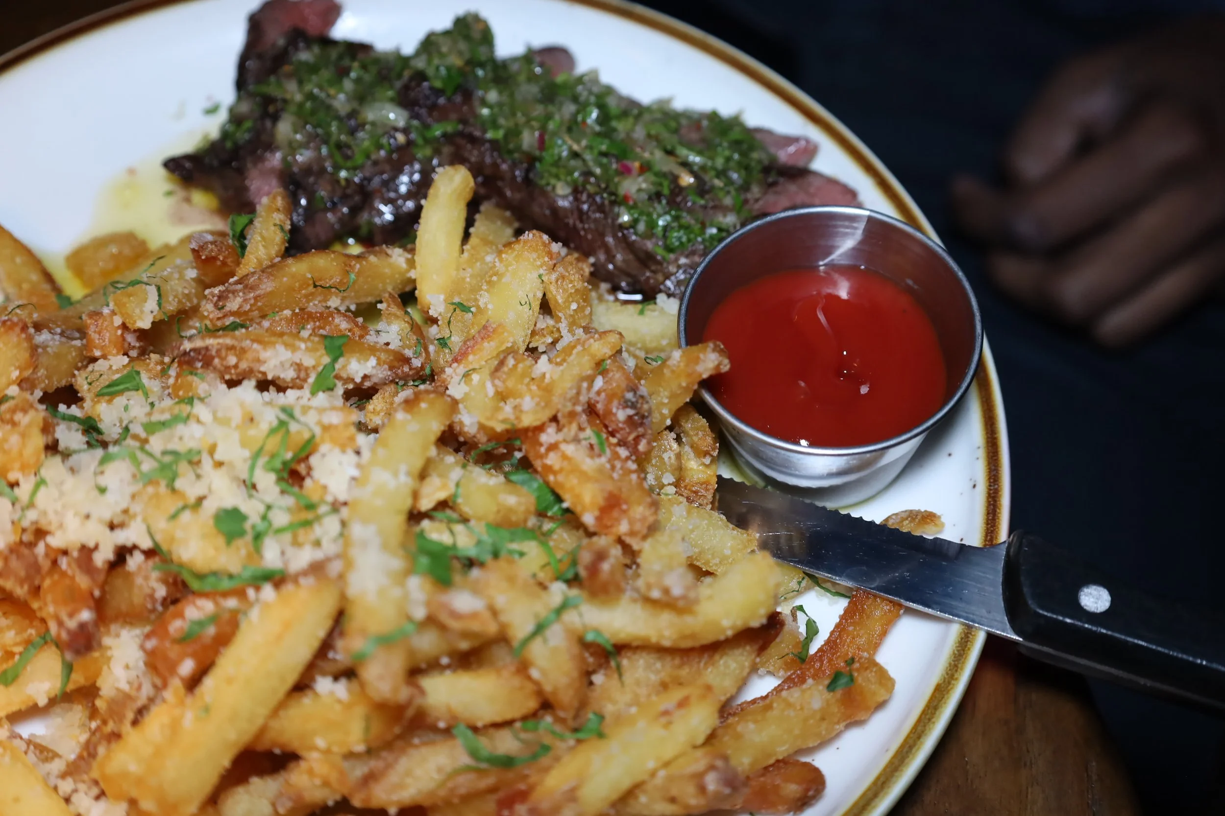 Fried French fries topped with chopped herbs, sliced steak with green sauce, and a small cup of ketchup on a white plate with a gold rim.