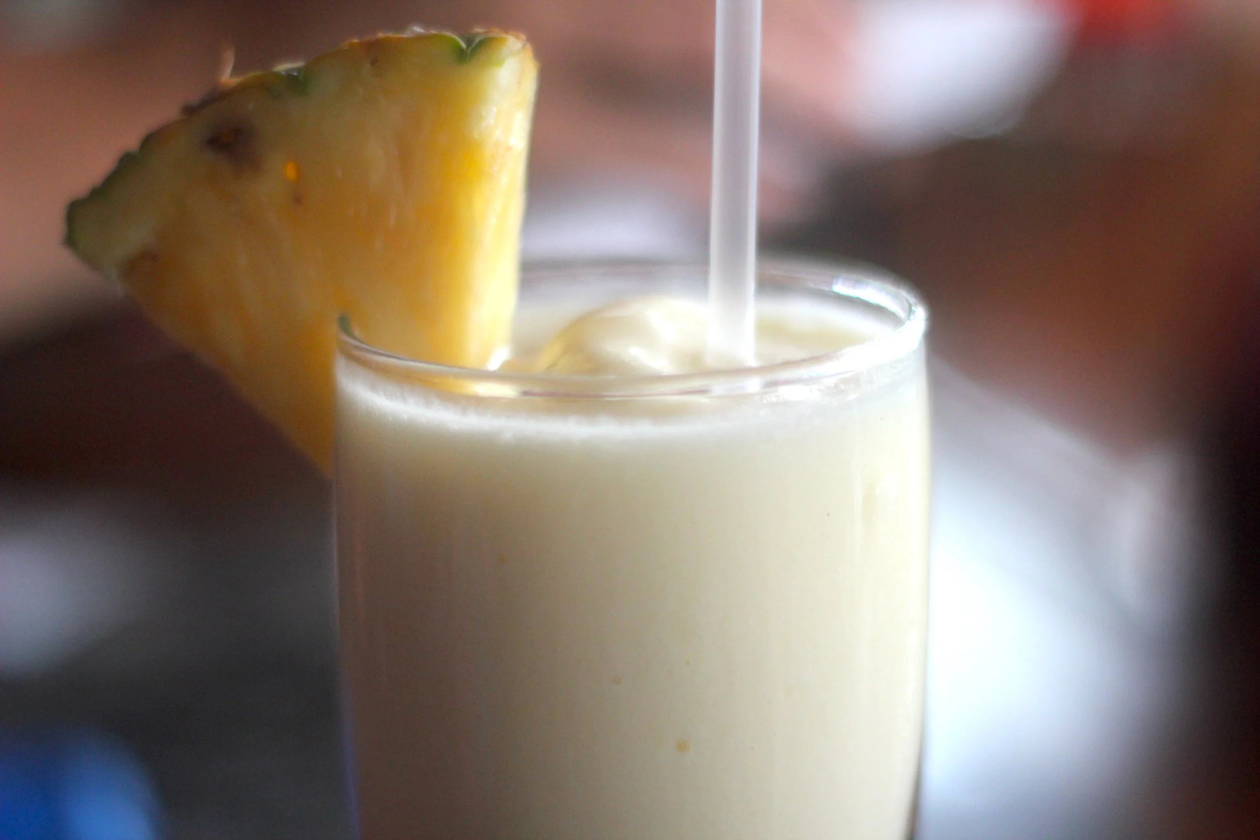 Close-up of a vanilla milkshake topped with a pineapple slice in a glass, with a person in the background pouring a beverage.