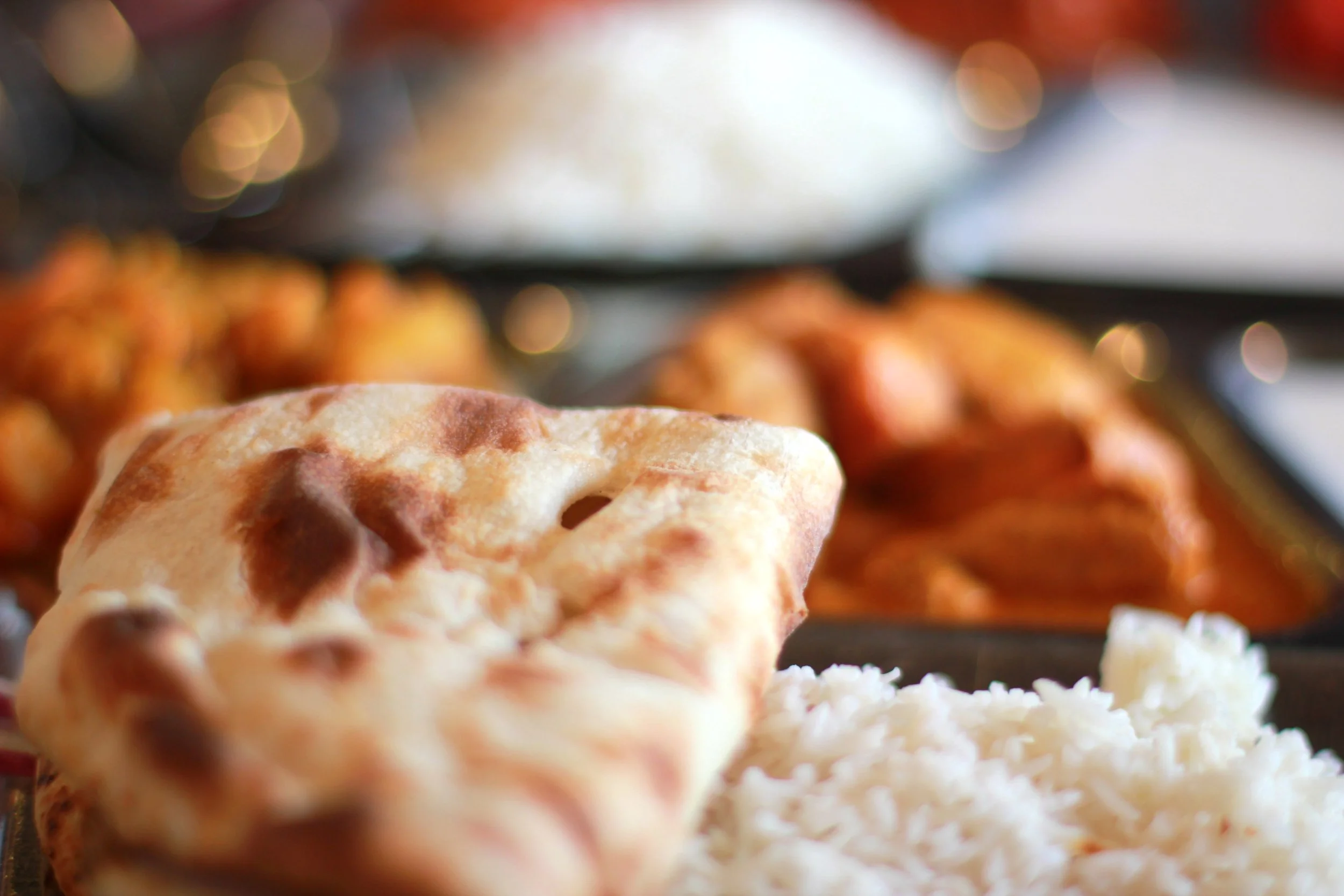 Close-up of a piece of naan bread, with rice and curry dishes in the background.