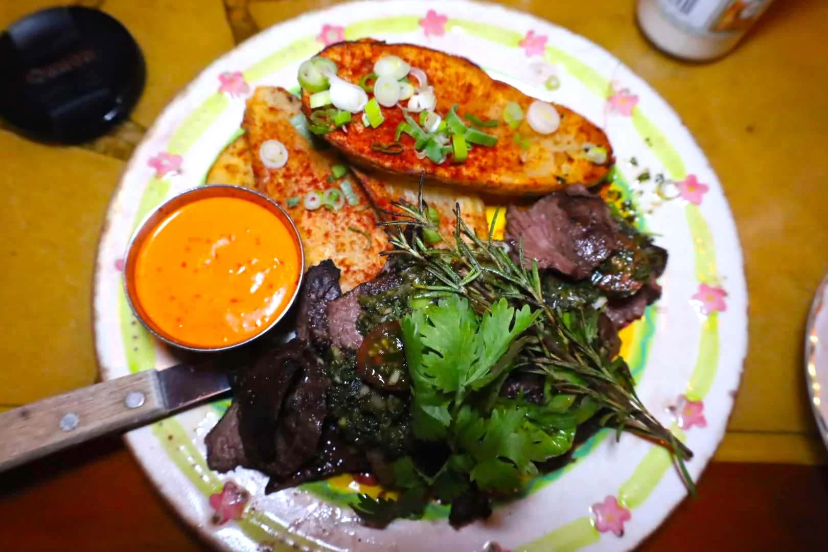 A plate of grilled steak, stuffed jalapeños topped with green onions, a halved baked potato with green onions, and a small bowl of orange dipping sauce, garnished with fresh herbs, on a round floral-patterned plate.