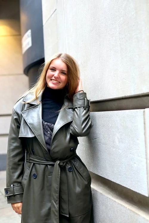 A young woman with blonde hair in a leather trench coat standing against a concrete wall.