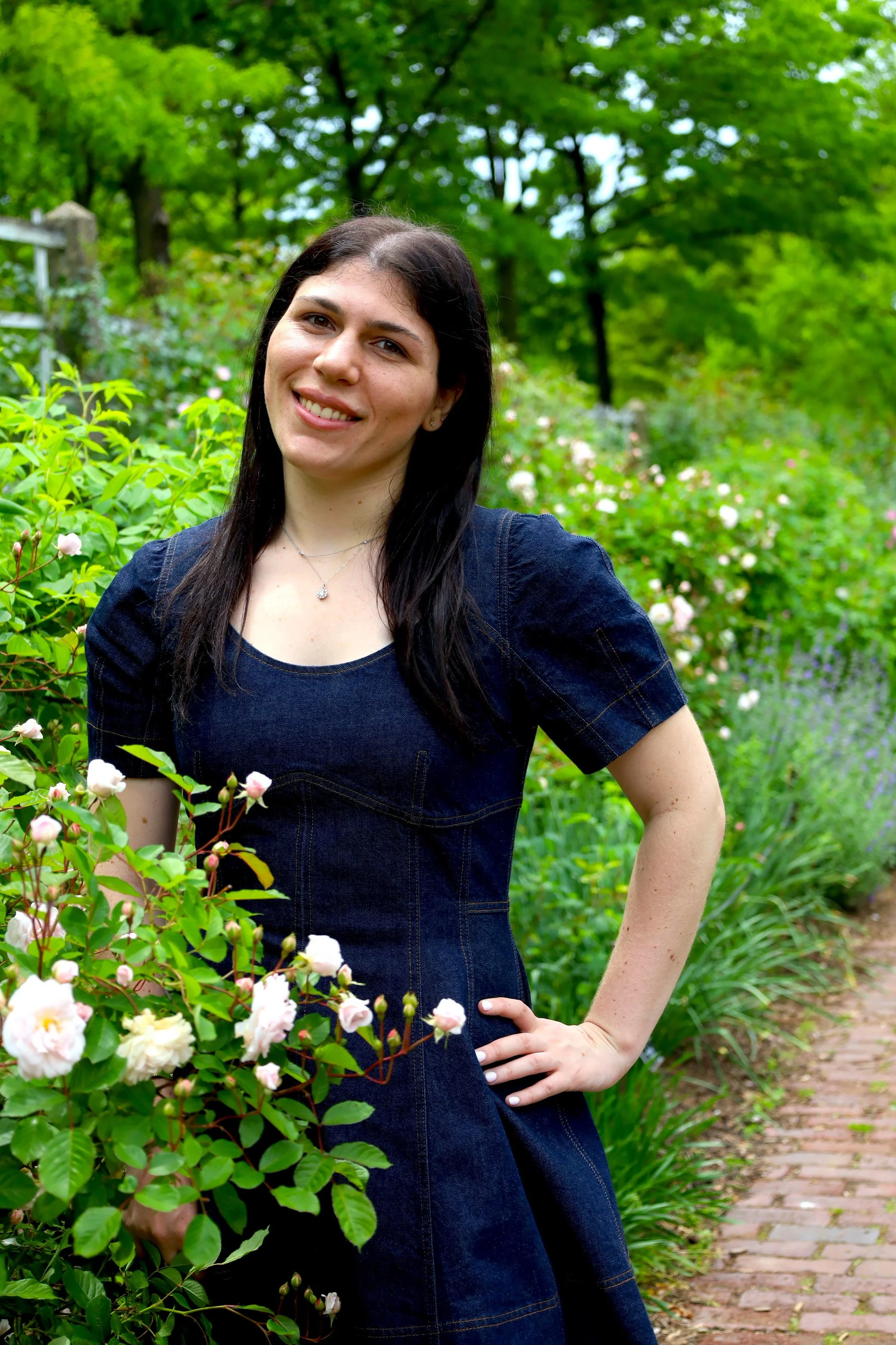 A woman with long dark hair wearing a dark blue dress, standing in a garden with green trees and flowering bushes, smiling at the camera.