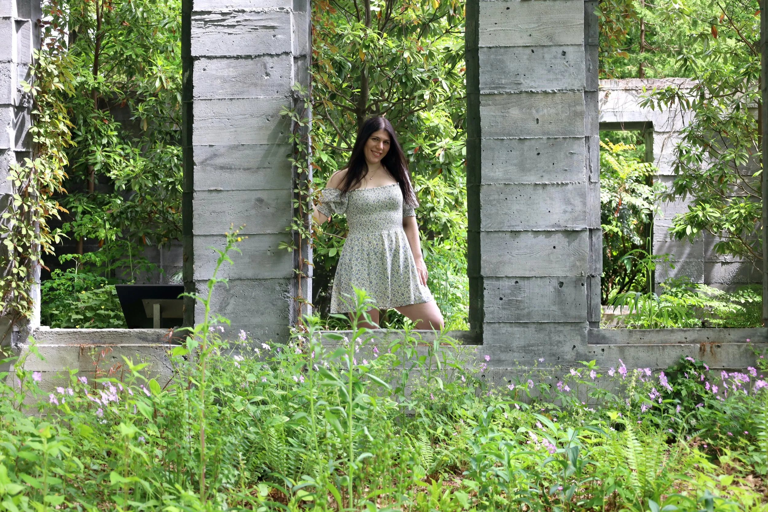 A woman with long dark hair wearing a light-colored floral dress, smiling while standing inside an abandoned concrete structure overgrown with green plants and vines.