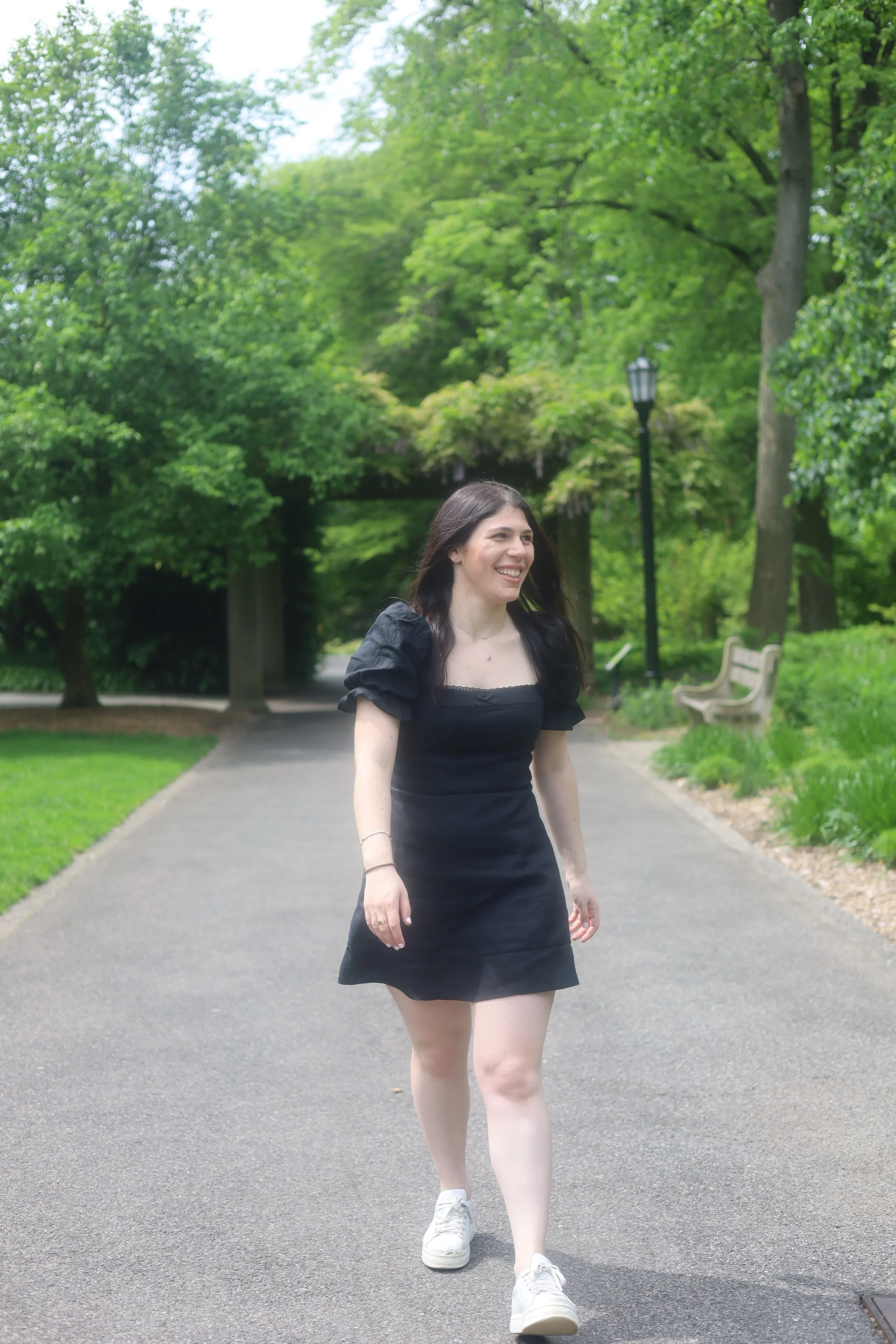 A young woman walking along a park path with green trees, benches, and a streetlamp in the background, smiling and enjoying a pleasant day.