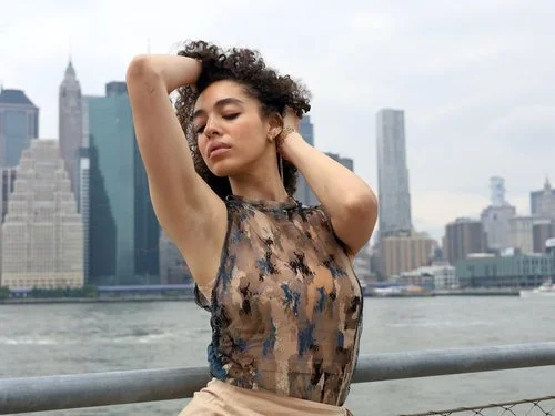 A woman with curly hair standing outdoors near a river with city buildings in the background, wearing a sleeveless sheer top.