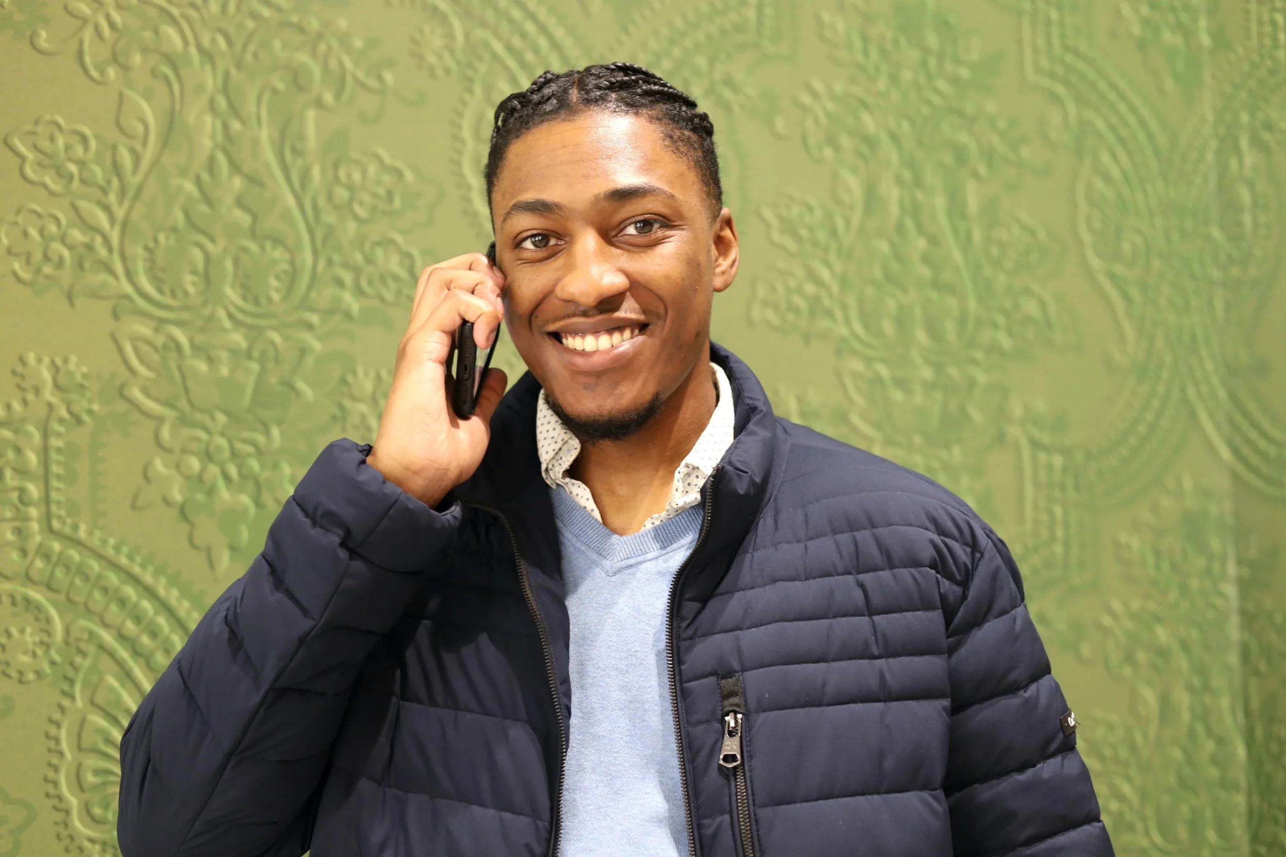 A young man smiling while talking on a cell phone, standing against a green patterned background.