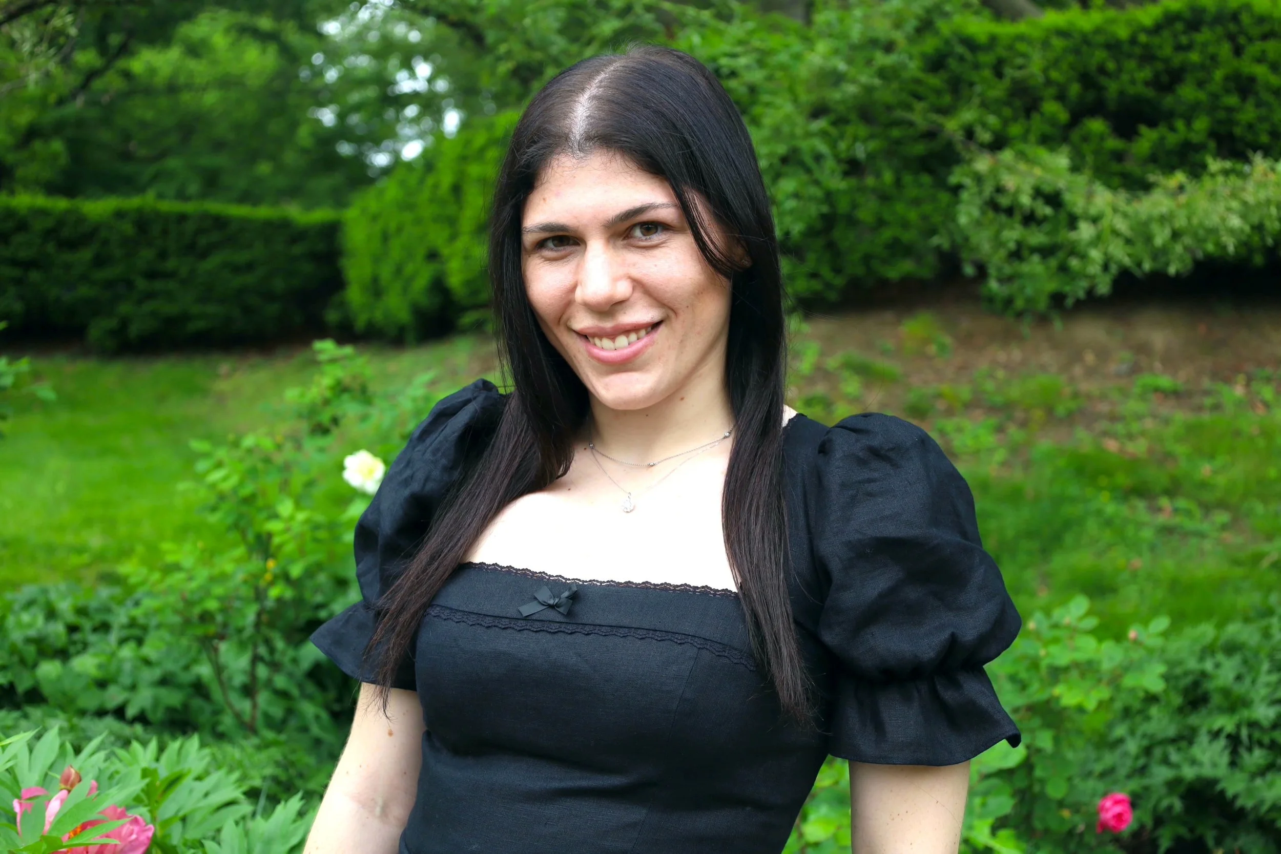 A young woman with long dark hair smiling outdoors in a garden with green bushes and flowering plants.